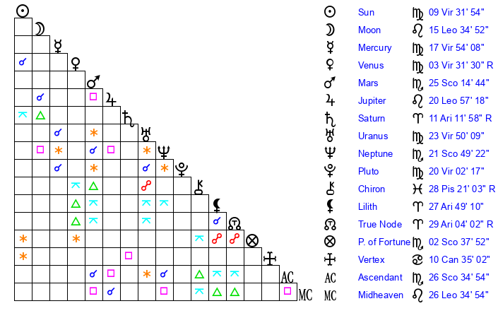 | Sun | 9 Virgo 32 | 10 Virgo 28 | 6 Scorpio 35 |