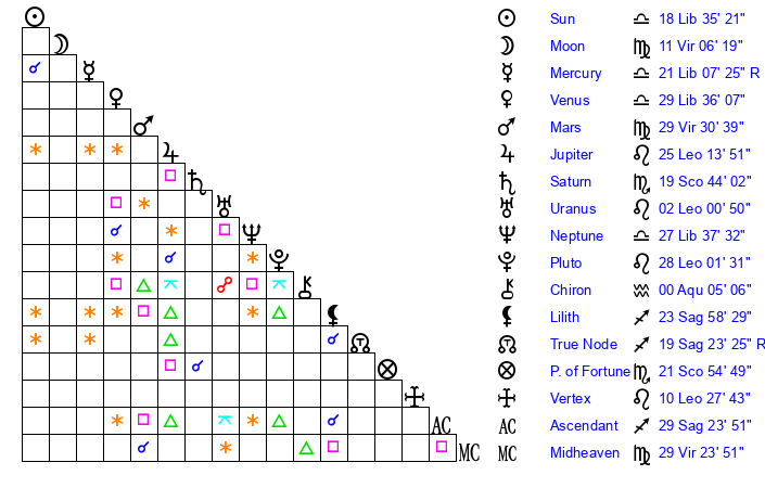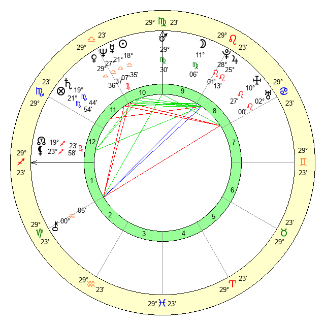 | Mars | 29 Virgo 31 | 13 Scorpio 55 | 14 Scorpio 43 |