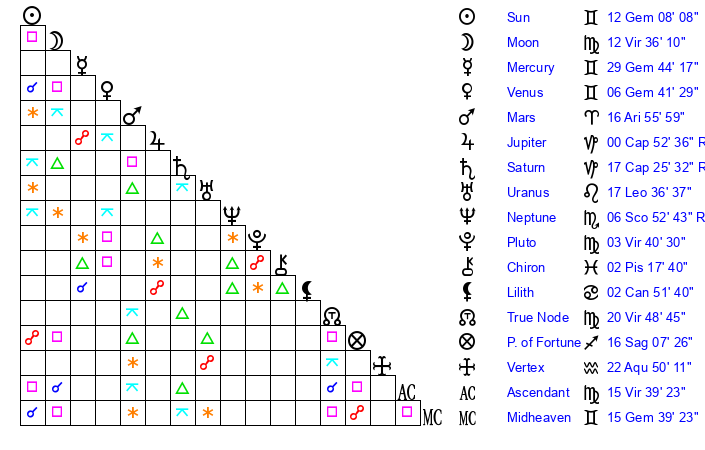 | Moon | 12 Virgo 29 | 7 Virgo 26 | 8 Aquarius 30 |