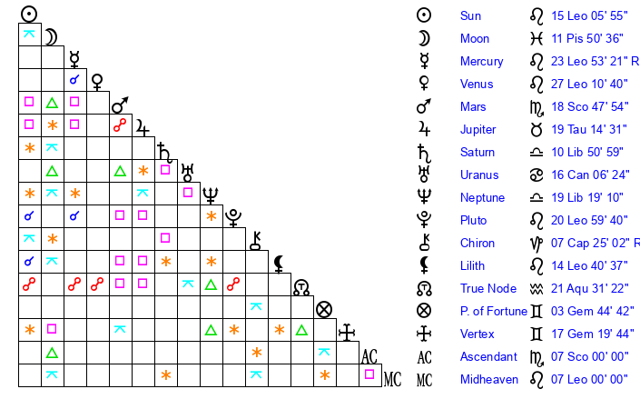 | Pluto | 21 Leo 0 | 2 Aquarius 15 | 22 Leo 57 |