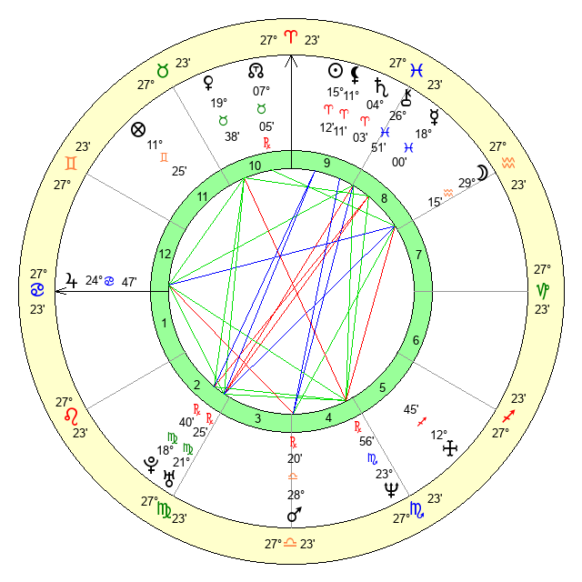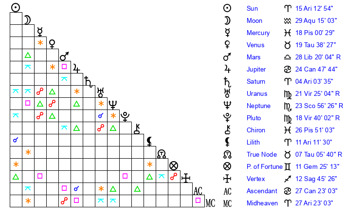 | Saturn | 4 Aries 14 | 24 Pisces 58 | 10 Aries 24 |