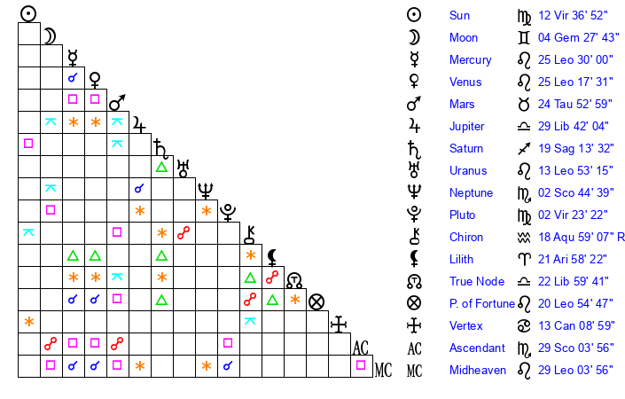 | Uranus | 13 Leo 54 | 1 Gemini 29 | 16 Leo 20 |