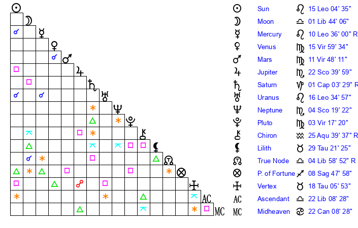 | Mercury | 10 Leo 35 | 4 Leo 43 | 6 Scorpio 20 |