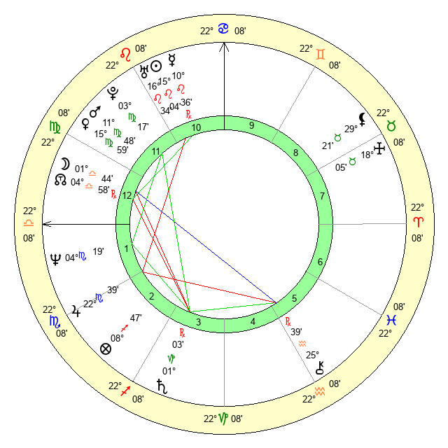 | Venus | 15 Virgo 59 | 9 Cancer 33 | 7 Virgo 2 |