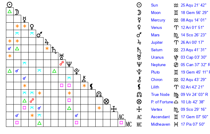 | Sun | 25 Aquarius 22 | 26 Aquarius 15 | 22 Gemini 56 |