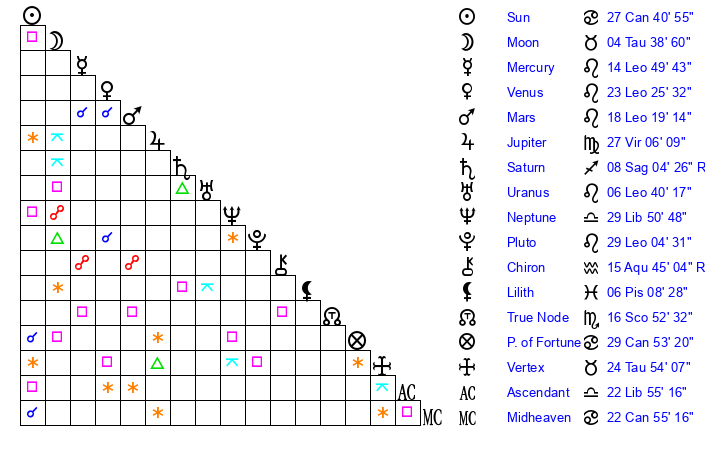 | Pluto | 29 Leo 4 | 2 Aquarius 41 | 1 Virgo 13 |