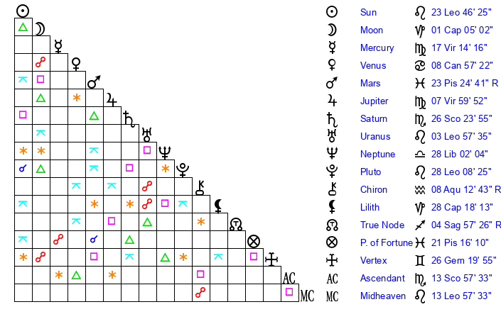 | Sun | 23 Leo 46 | 24 Leo 5 | 1 Scorpio 15 |