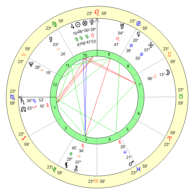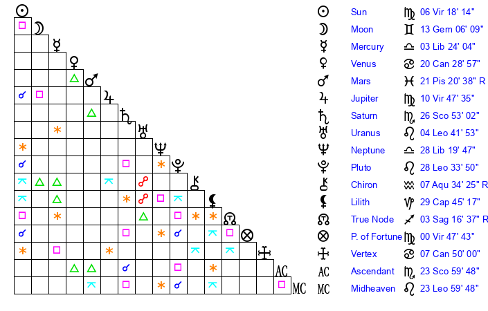 | Sun | 6 Virgo 18 | 6 Virgo 36 | 14 Scorpio 16 |