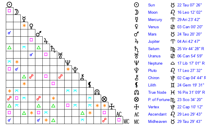 | Moon | 16 Leo 5 | 4 Sagittarius 13 | 13 Taurus 23 |