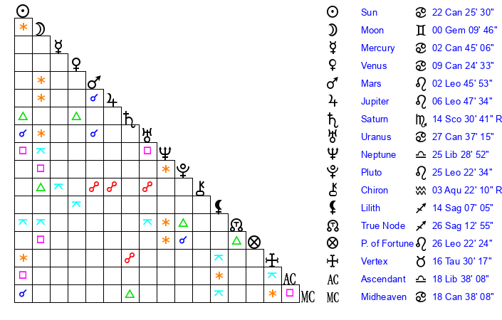 | Venus | 9 Cancer 24 | 12 Gemini 20 | 5 Libra 56 |