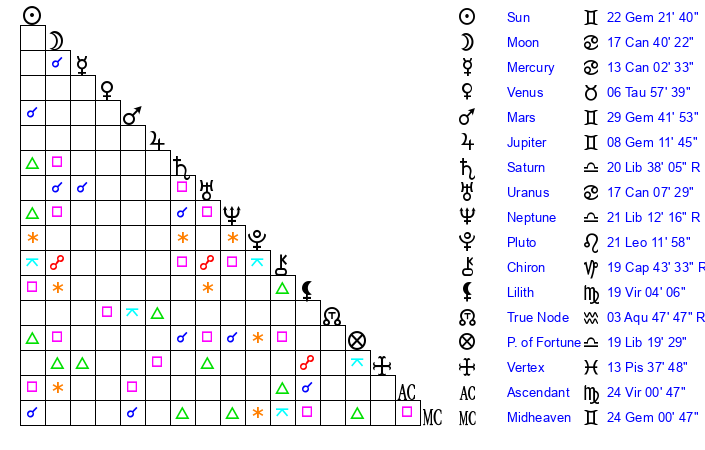 | Sun | 22 Gemini 21 | 22 Gemini 56 | 1 Virgo 12 |