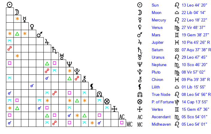 | Sun | 13 Leo 44 | 14 Leo 29 | 14 Libra 56 |