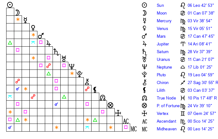 | Sun | 6 Leo 43 | 7 Leo 47 | 18 Libra 33 |