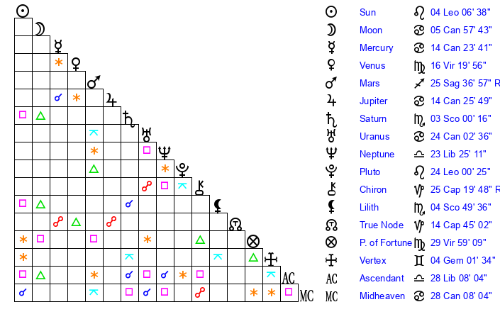 | Moon | 5 Cancer 49 | 10 Virgo 48 | 0 Aquarius 6 |