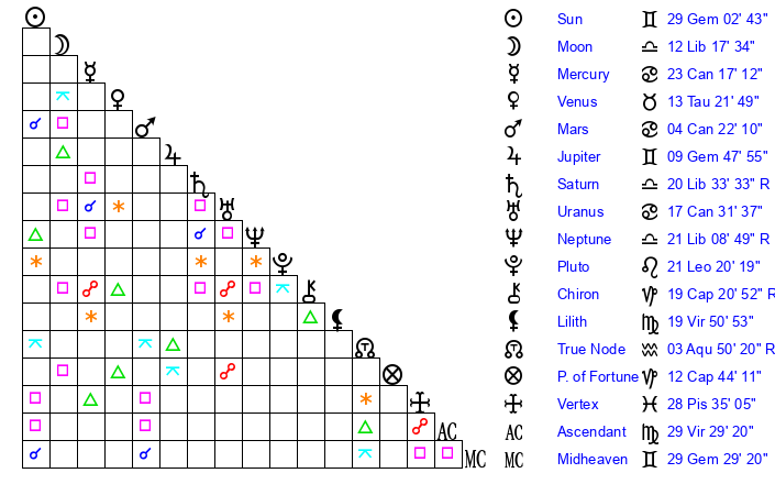 | Sun | 29 Gemini 2 | 29 Gemini 37 | 7 Virgo 58 |