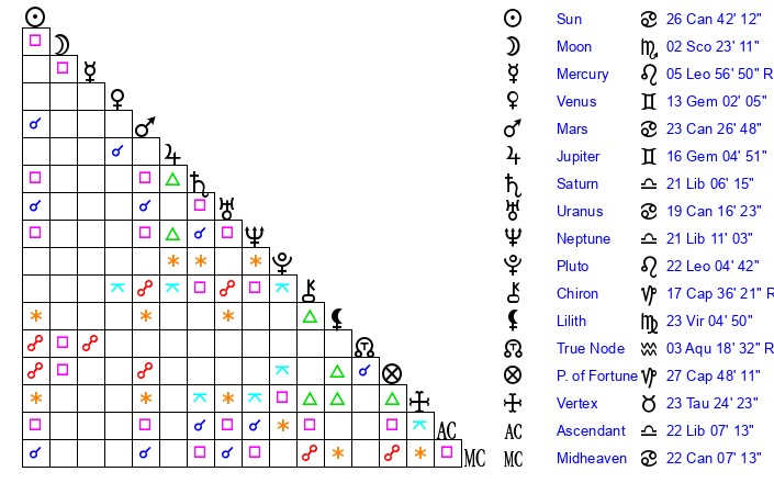 | Sun | 26 Cancer 42 | 27 Cancer 16 | 6 Libra 14 |