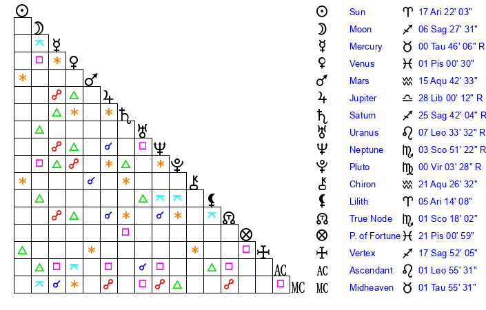 | Sun | 17 Aries 22 | 18 Aries 7 | 22 Gemini 9 |