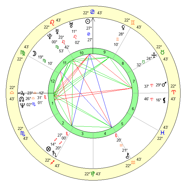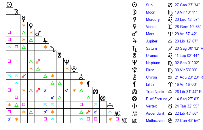 | Sun | 27 Cancer 27 | 28 Cancer 14 | 2 Libra 7 |