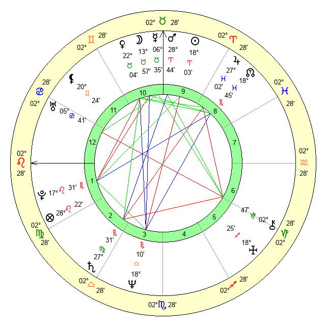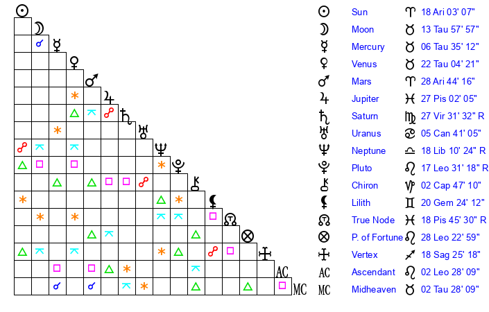 | Moon | 13 Taurus 52 | 1 Virgo 40 | 0 Aquarius 30 |