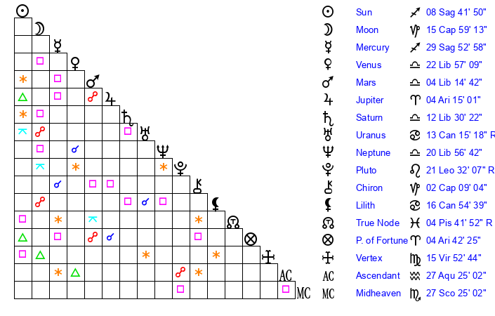 | Neptune | 20 Libra 57 | 29 Pisces 23 | 21 Libra 35 |