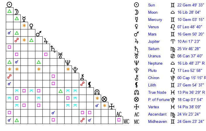 | Sun | 22 Gemini 49 | 23 Gemini 53 | 3 Virgo 36 |