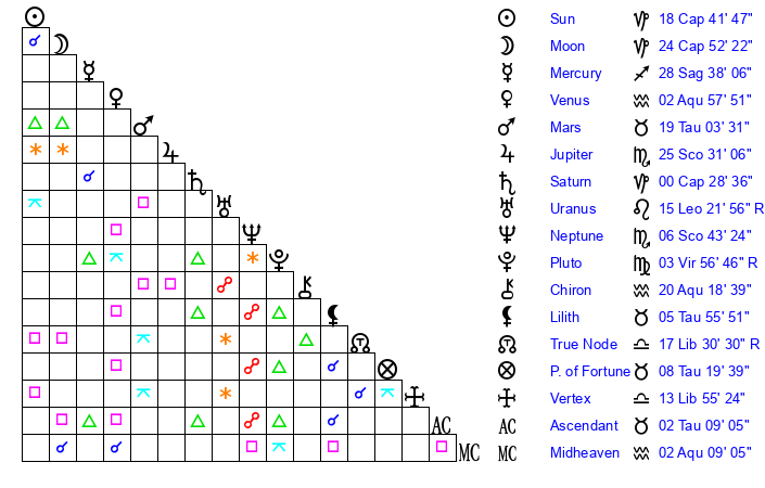 | Moon | 24 Capricorn 54 | 25 Taurus 21 | 14 Gemini 57 |
