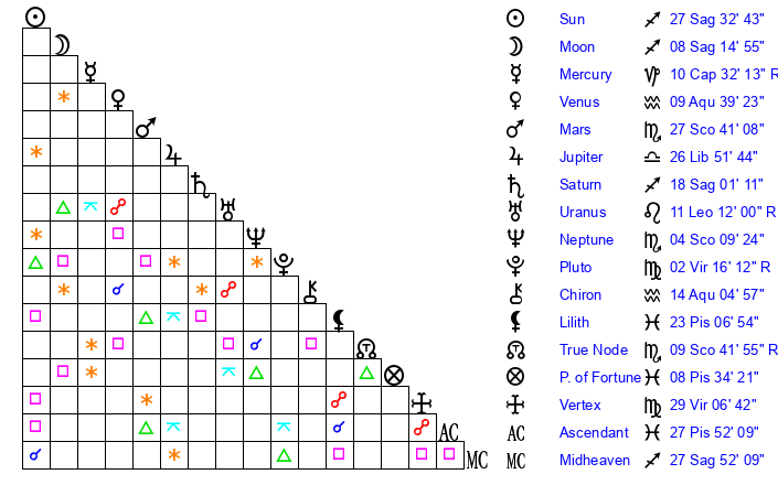 | Sun | 27 Sagittarius 32 | 28 Sagittarius 2 | 6 Pisces 35 |