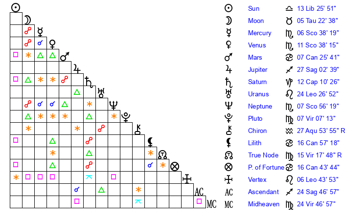 | Neptune | 7 Scorpio 55 | 0 Aries 23 | 10 Scorpio 15 |