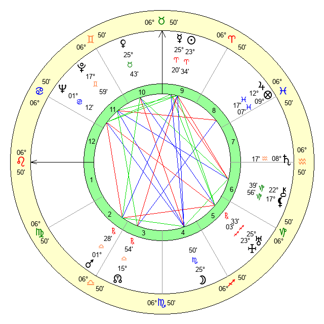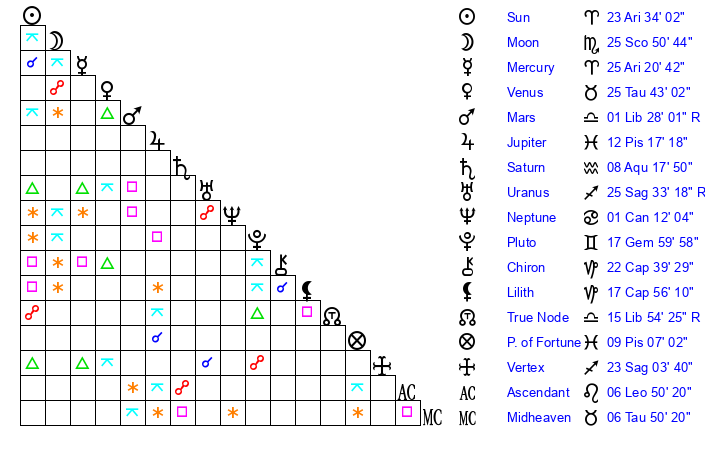 | Sun | 23 Aries 34 | 25 Aries 0 | 20 Leo 42 |