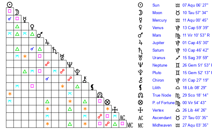 | Moon | 10 Taurus 59 | 14 Capricorn 55 | 20 Scorpio 42 |