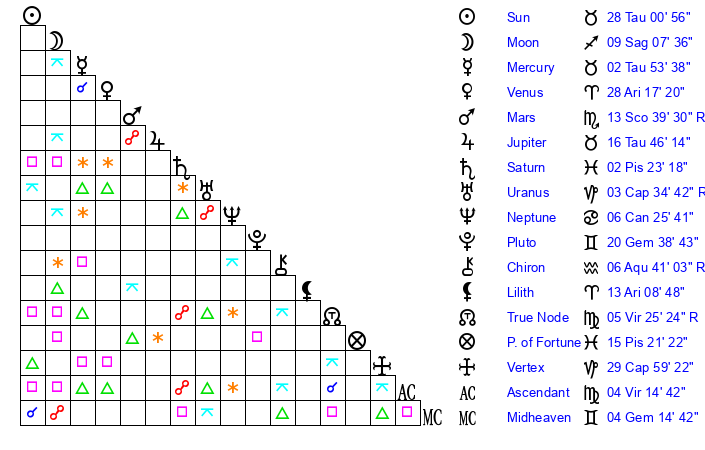 | Sun | 28 Taurus 1 | 28 Taurus 58 | 23 Virgo 8 |