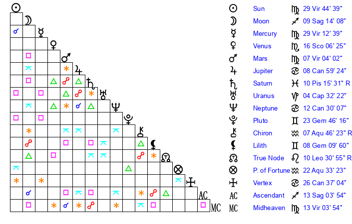 | Sun | 29 Virgo 45 | 0 Libra 55 | 29 Capricorn 31 |