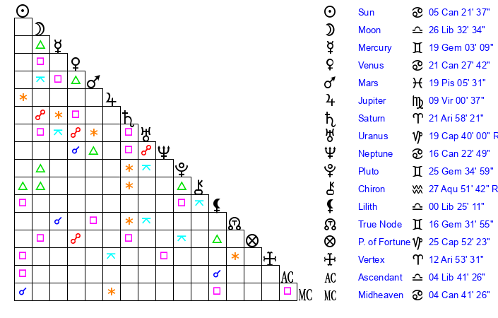 | Sun | 5 Cancer 22 | 6 Cancer 18 | 27 Libra 40 |