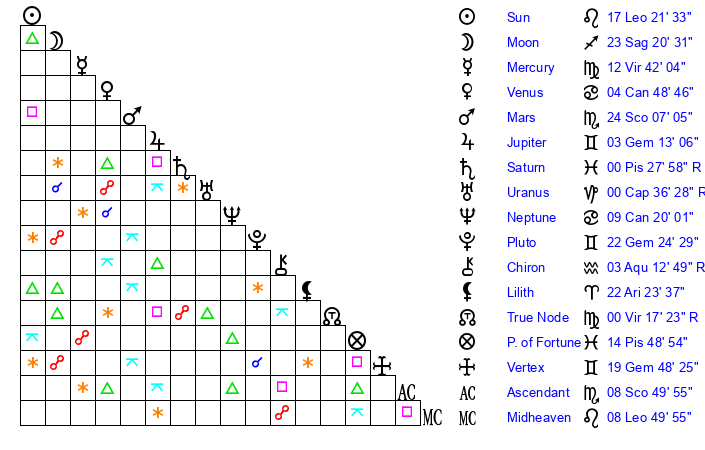 | Sun | 17 Leo 21 | 18 Leo 19 | 15 Sagittarius 58 |