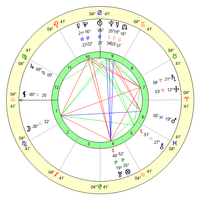 | Sun | 5 Cancer 22 | 6 Cancer 18 | 27 Libra 40 |