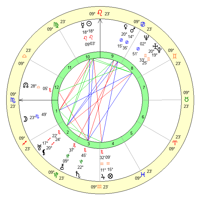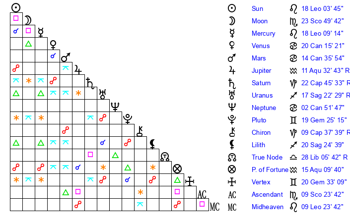 | Moon | 23 Scorpio 58 | 19 Pisces 42 | 15 Taurus 33 |