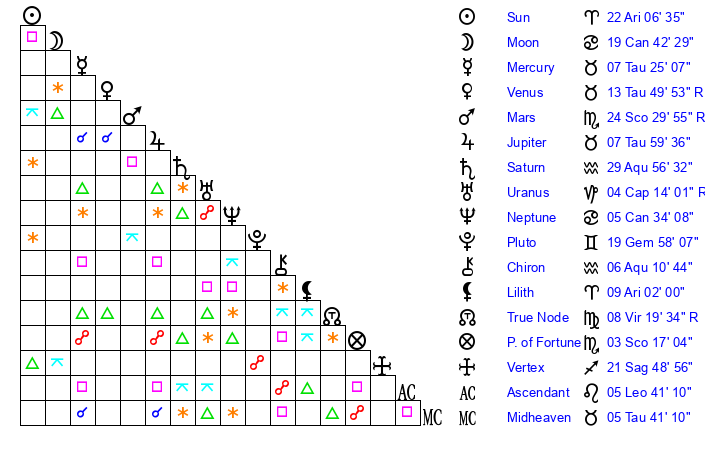 | Pluto | 19 Gemini 59 | 3 Aquarius 42 | 22 Gemini 25 |