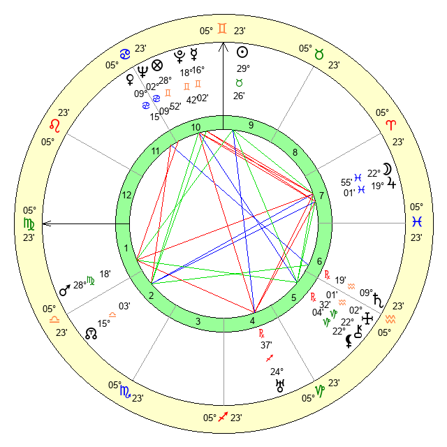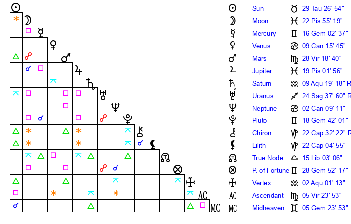 | Moon | 22 Pisces 46 | 16 Pisces 12 | 19 Virgo 58 |