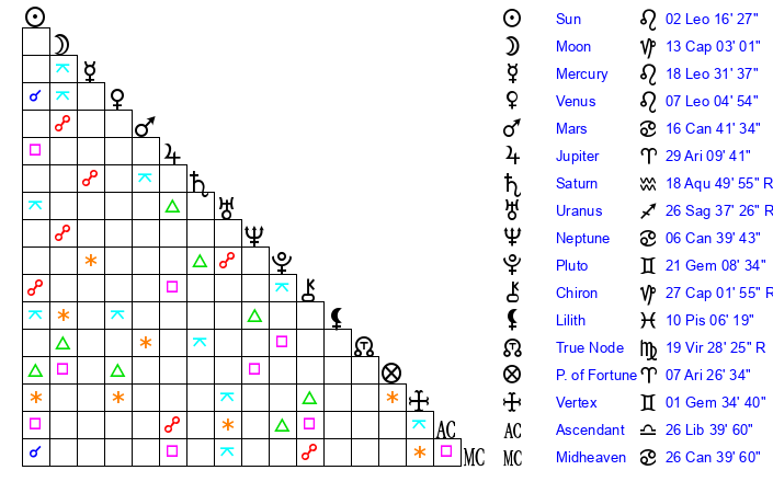 | Moon | 12 Capricorn 56 | 14 Leo 26 | 7 Gemini 52 |