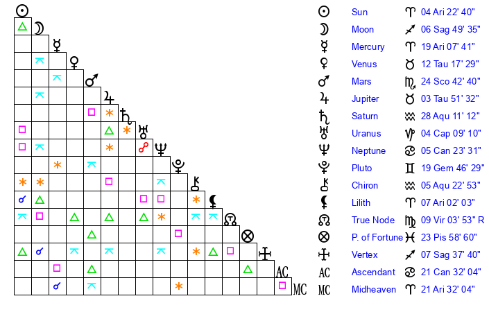 | Moon | 6 Sagittarius 49 | 14 Aquarius 24 | 20 Aries 55 |