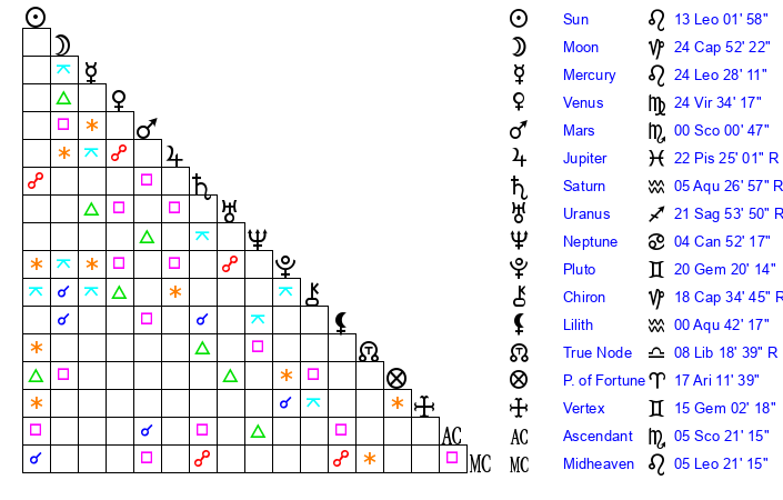 | Mercury | 24 Leo 28 | 5 Leo 21 | 21 Sagittarius 45 |