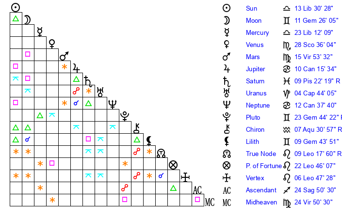 | Moon | 11 Gemini 31 | 22 Aries 13 | 14 Libra 14 |