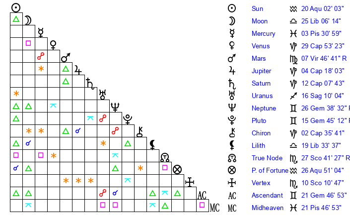| Sun | 20 Aquarius 1 | 20 Aquarius 57 | 21 Gemini 42 |