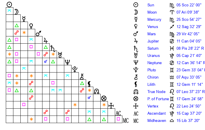 | Sun | 5 Scorpio 22 | 6 Scorpio 31 | 5 Pisces 57 |