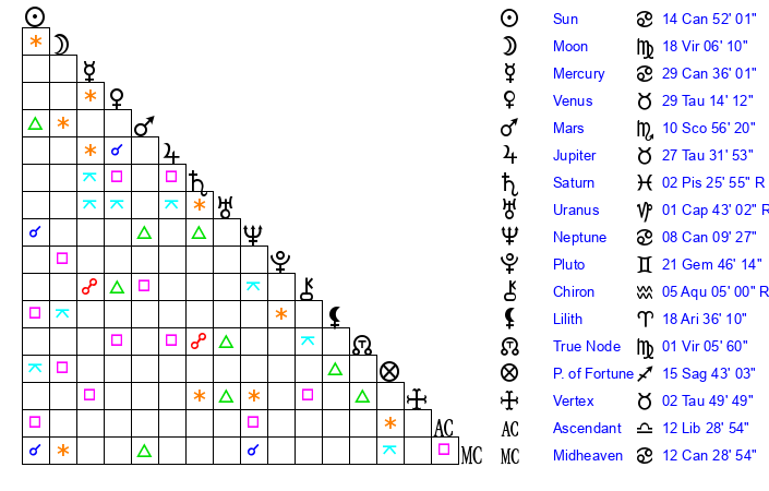 | Moon | 18 Virgo 9 | 9 Sagittarius 30 | 19 Aquarius 10 |
