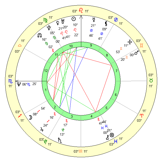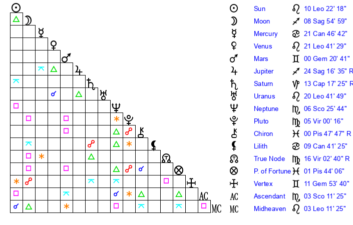 | Uranus | 20 Leo 44 | 0 Gemini 59 | 24 Leo 29 |
