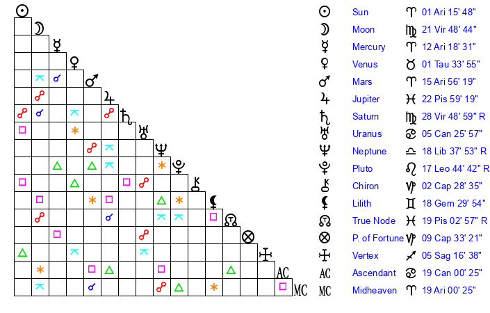 | Sun | 1 Aries 16 | 2 Aries 19 | 13 Gemini 15 |