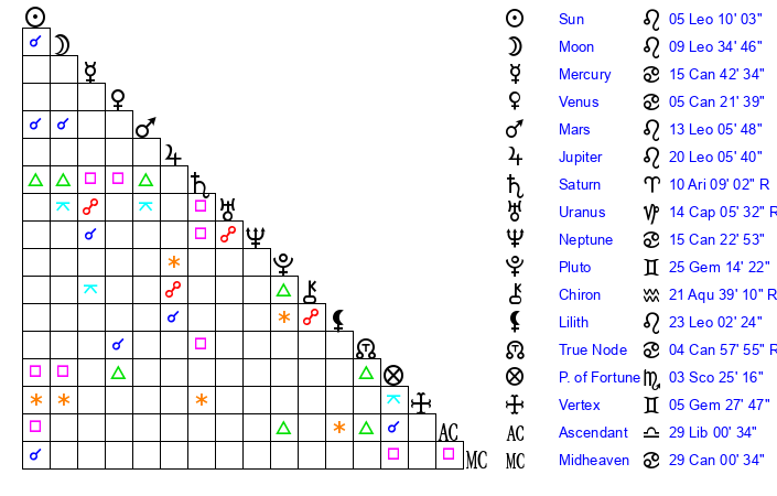 | Moon | 9 Leo 32 | 23 Virgo 28 | 15 Scorpio 28 |