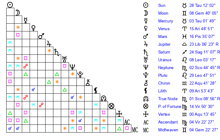 | Sun | 28 Taurus 12 | 28 Taurus 58 | 2 Leo 14 |