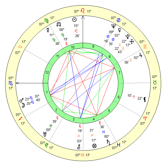 | Moon | 25 Scorpio 41 | 8 Aquarius 41 | 16 Aries 10 |
